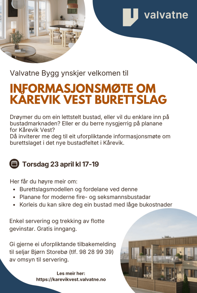 Alle Nyheter Informasjonsmøte Kårevik Vest Torsdag 23.04 kl 17-19 Skrevet av kjersti Publisert den 22 april 2026